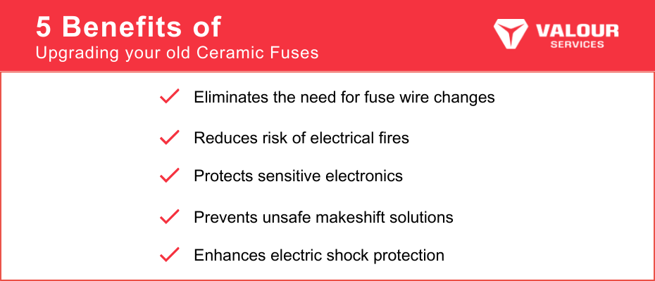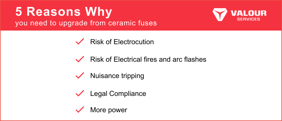 Replacing your ceramic fuses goes beyond overload protection. Upgrading your electrical system with Residual Current Breakers with Over-current protection (RCBO) will provide overload, short circuit and earth-leakage protection. Additionally, Arc Fault Detection Devices (AFDD) mitigate the risk of electrical fires caused by electrical arcs. In short, these devices will protect you and your household from electrical damage, electrical fires and electric shock.