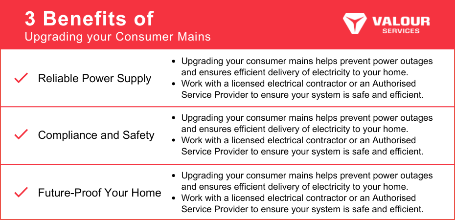 Your home’s power distribution system, including consumer mains, plays a crucial role in delivering electrical power efficiently from the supply network to your residence. Modern consumer mains will help prevent power outages and other electrical issues. Working with a licensed electrical contractor or an Authorised Service Provider (ASP) to update outdated systems or install modern consumer mains is essential for a steady, safe, and efficient power supply, protecting against electrical fires and ensuring your appliances and overall electrical infrastructure remain in excellent working condition.