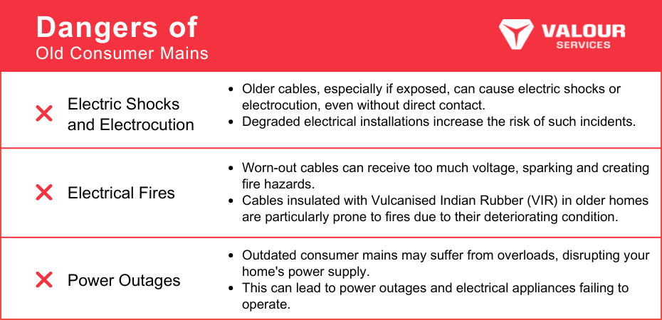 Outdated consumer mains are more likely to suffer from overloads, disrupting the reliable power supply. This could lead to power outages and electrical appliances failing to function.