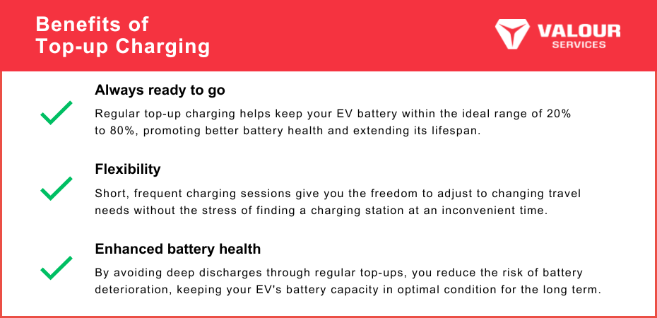 Top-up charging means connecting your electric car to a charger multiple times for short periods rather than waiting for a single long session to fully charge the battery. This method is especially useful for EV drivers with larger battery capacities, as it reduces the extended charging times often required when running the battery low.